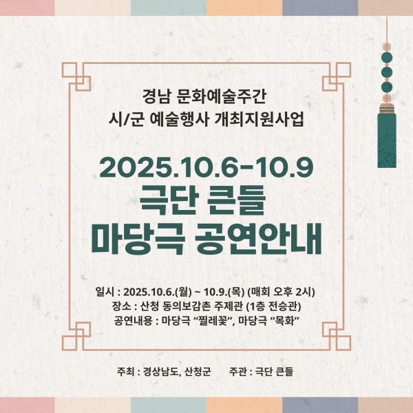 큰들문화예술센터 <마당극공연> 페이지 정보 작성자 광대소식 작성일25-10-02 17:06 조회19회 댓글0건 관련링크 다음글 목록 답변 본문 큰들문화예술센터 <마당극공연>2025. 10. 3~9 산청 동의보감 주제관(1층 전승관) 댓글목록 등록된 댓글이 없습니다. 다음글 목록 답변